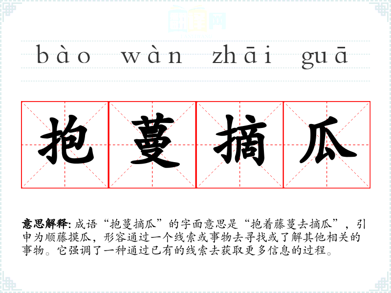 在英语中,“follow the trail”或“connect the dots”可以与“抱蔓摘瓜”相对应,都是通过已有线索去推导或理解其他信息的过程。虽然表达方式不同,但核心思想相似。