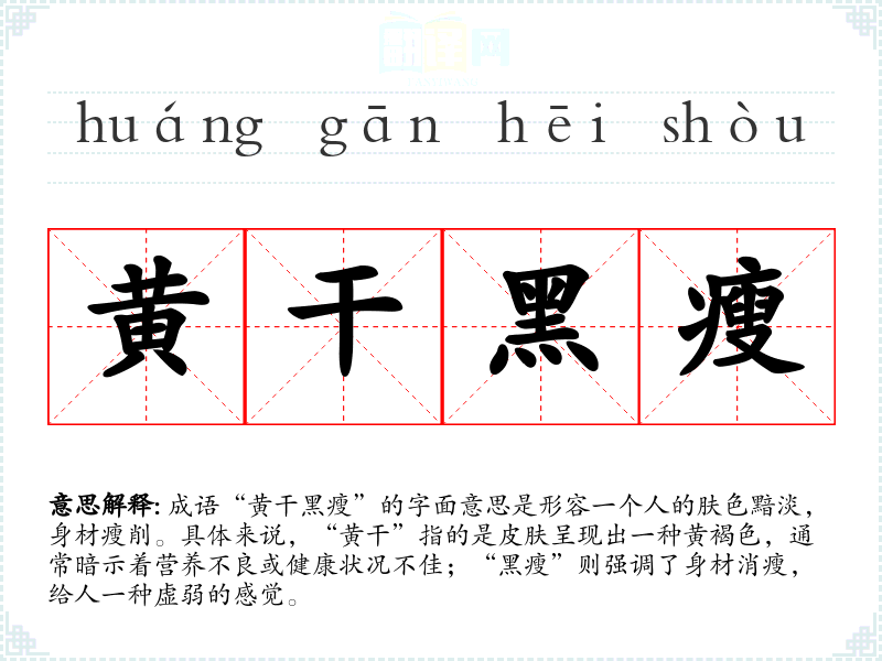 成语“黄干黑瘦”的字面意思是形容一个人的肤色黯淡,身材瘦削。具体来说,“黄干”指的是皮肤呈现出一种黄褐色,通常暗示着营养不良或健康状况不佳;“黑瘦”则强调了身材消瘦,给人一种虚弱的感觉。