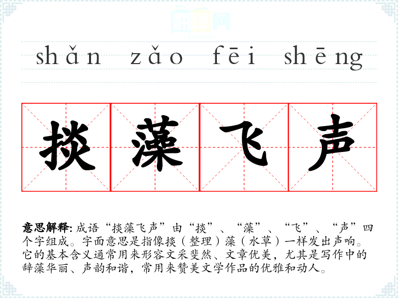 成语“掞藻飞声”由“掞”、“藻”、“飞”、“声”四个字组成。字面意思是指像掞(整理)藻(水草)一样发出声响。它的基本含义通常用来形容文采斐然、文章优美,尤其是写作中的辞藻华丽、声韵和谐,常用来赞美文学作品的优雅和动人。