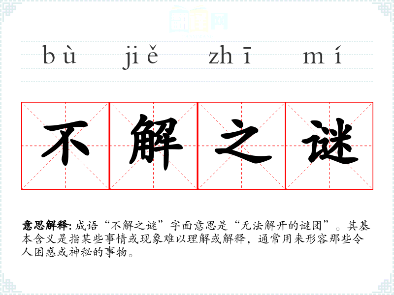 成语“不解之谜”字面意思是“无法解开的谜团”。其基本含义是指某些事情或现象难以理解或解释,通常用来形容那些令人困惑或神秘的事物。