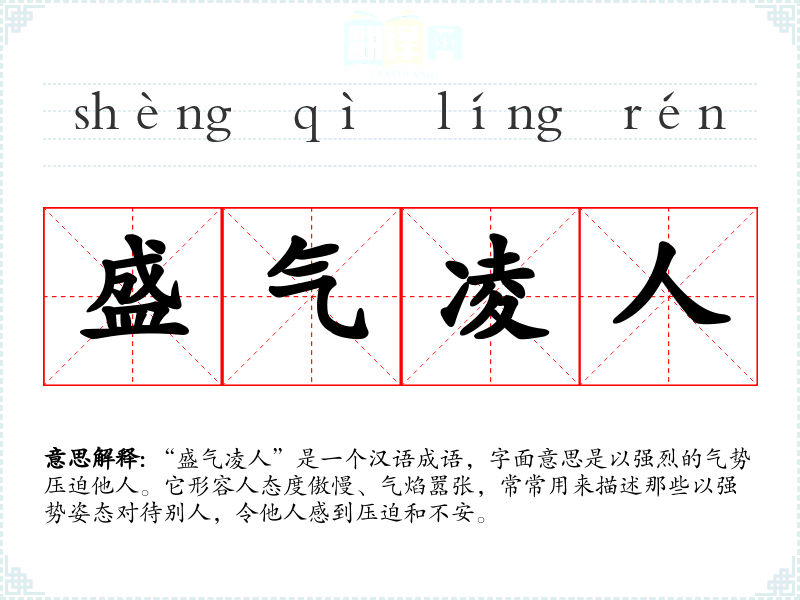 “盛气凌人”是一个汉语成语,字面意思是以强烈的气势压迫他人。它形容人态度傲慢、气焰嚣张,常常用来描述那些以强势姿态对待别人,令他人感到压迫和不安。