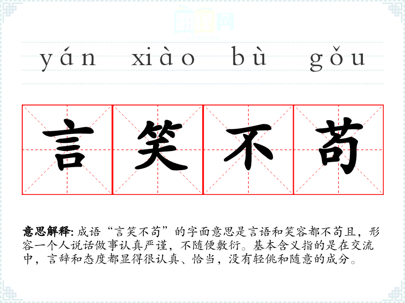 成语“言笑不苟”的字面意思是言语和笑容都不苟且,形容一个人说话做事认真严谨,不随便敷衍。基本含义指的是在交流中,言辞和态度都显得很认真、恰当,没有轻佻和随意的成分。