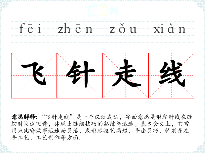“飞针走线”是一个汉语成语,字面意思是形容针线在缝纫时快速飞舞,体现出缝纫技巧的熟练与迅速。基本含义上,它常用来比喻做事迅速而灵活,或形容技艺高超、手法灵巧,特别是在手工艺、工艺制作等方面。