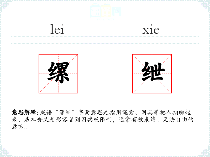 成语“缧绁”字面意思是指用绳索、网具等把人捆绑起来,基本含义是形容受到囚禁或限制,通常有被束缚、无法自由的意味。