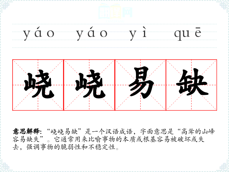 在**文化中,自然与人事的关系常常被用来比喻人类社会的脆弱与不确定性。“峣峣易缺”不仅可以用来反映物质世界的脆弱性,也可以用来阐述道德、情感等方面的脆弱。在现代社会,这一成语仍有其适用性,尤其在强调风险管理和危机应对时。