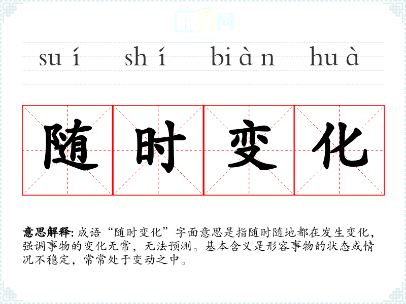 “随时变化”并没有特定的历史典故或文学出处,可能是现代汉语的一个常用表达,反映了社会快速发展的特点。在科技、经济等领域,事物的变化频繁,因而该表达在现代社会中逐渐流行。