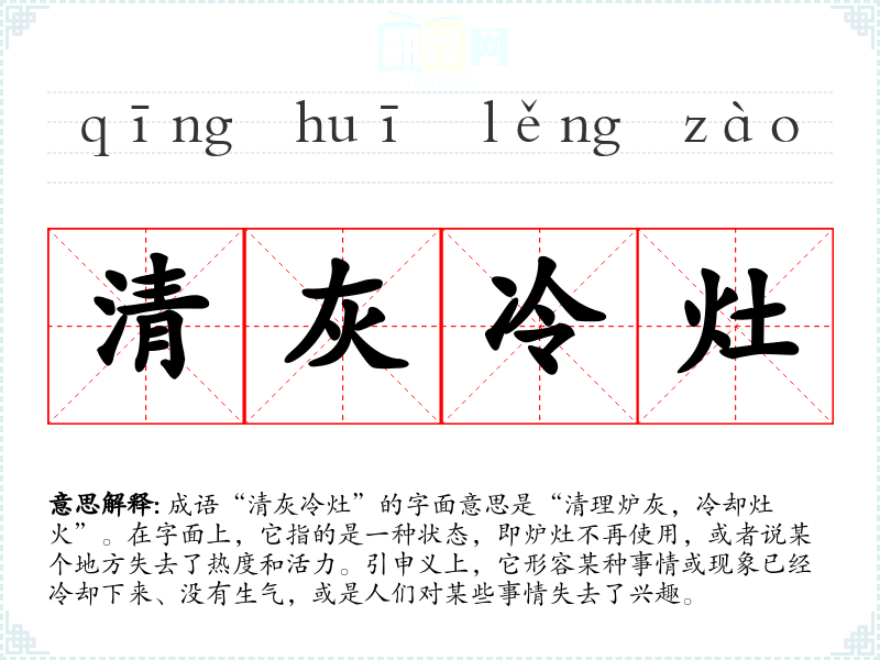 成语“清灰冷灶”的字面意思是“清理炉灰,冷却灶火”。在字面上,它指的是一种状态,即炉灶不再使用,或者说某个地方失去了热度和活力。引申义上,它形容某种事情或现象已经冷却下来、没有生气,或是人们对某些事情失去了兴趣。