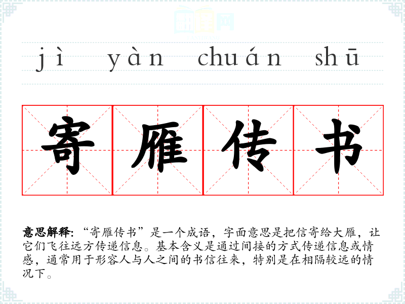 在古代,书信是人们沟通的重要方式,尤其是在战乱或交通不便的时期。“寄雁传书”体现了人们对亲情、友情的珍视。在现代社会,虽然科技已经让信息传递变得迅速便利,但这一成语仍然具有一定的情感价值,特别是在表达思念时。