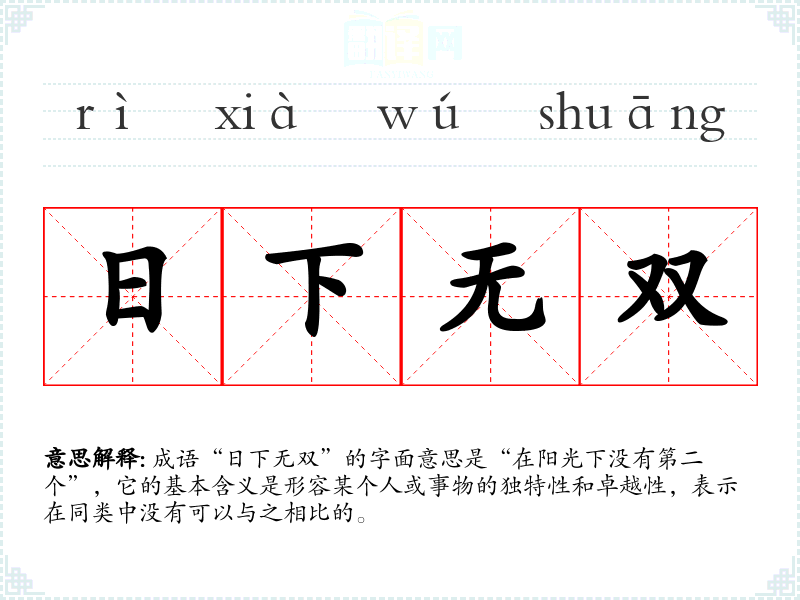 成语“日下无双”的字面意思是“在阳光下没有第二个”,它的基本含义是形容某个人或事物的独特性和卓越性,表示在同类中没有可以与之相比的。