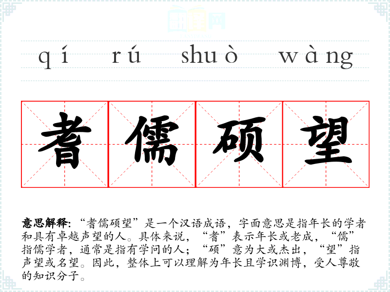 “耆儒硕望”是一个汉语成语,字面意思是指年长的学者和具有卓越声望的人。具体来说,“耆”表示年长或老成,“儒”指儒学者,通常是指有学问的人;“硕”意为大或杰出,“望”指声望或名望。因此,整体上可以理解为年长且学识渊博,受人尊敬的知识分子。