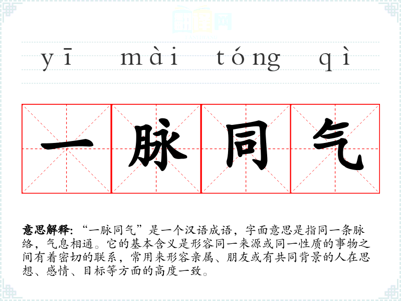“一脉同气”是一个汉语成语,字面意思是指同一条脉络,气息相通。它的基本含义是形容同一来源或同一性质的事物之间有着密切的联系,常用来形容亲属、朋友或有共同背景的人在思想、感情、目标等方面的高度一致。