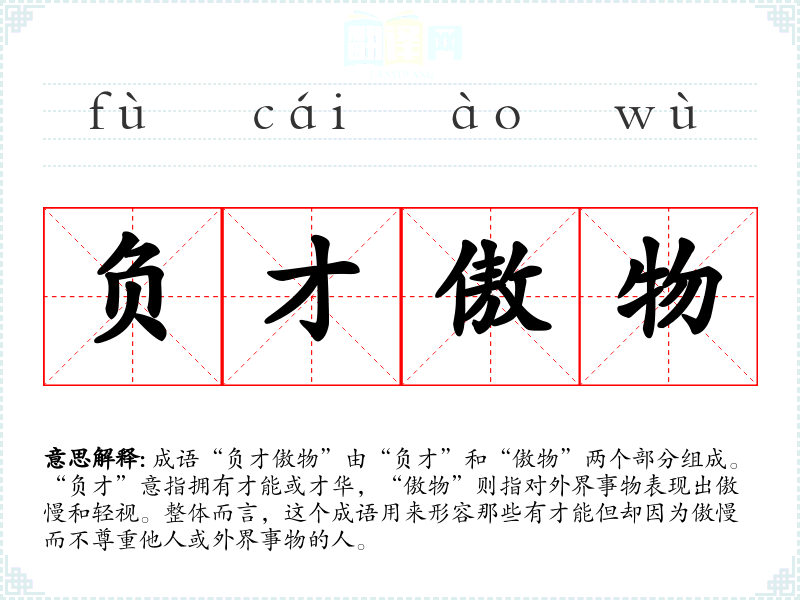 成语“负才傲物”由“负才”和“傲物”两个部分组成。“负才”意指拥有才能或才华,“傲物”则指对外界事物表现出傲慢和轻视。整体而言,这个成语用来形容那些有才能但却因为傲慢而不尊重他人或外界事物的人。