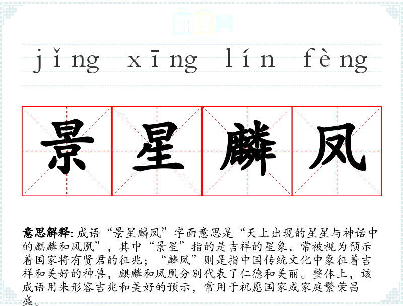 - 同义成语:如“吉祥如意”、“凤求凰”。这些成语同样表达了美好、吉祥的愿望,但“景星麟凤”更强调天象与神兽的结合。