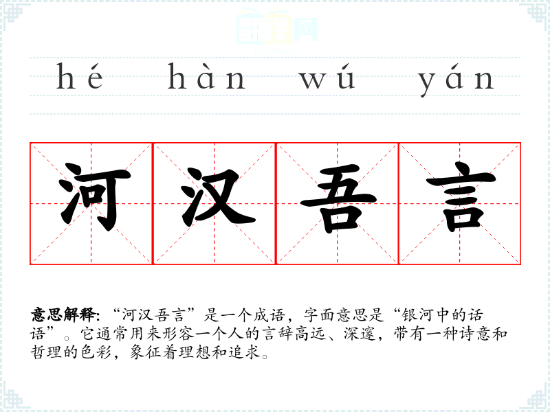 “河汉吾言”是一个成语,字面意思是“银河中的话语”。它通常用来形容一个人的言辞高远、深邃,带有一种诗意和哲理的色彩,象征着理想和追求。