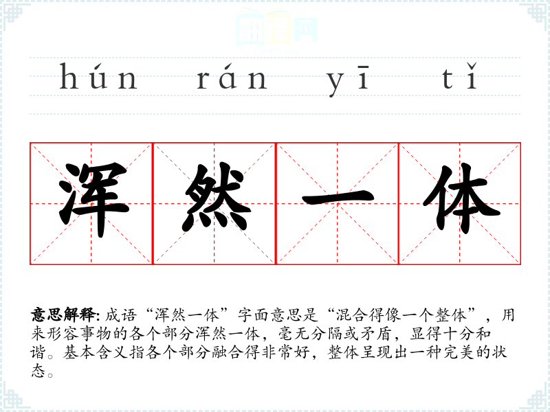 | 浑然一体 | 混然:混同在一起的样子。融合成一个整体,不可分割。也形容文章绘画,布置匀整,结构谨严。 |