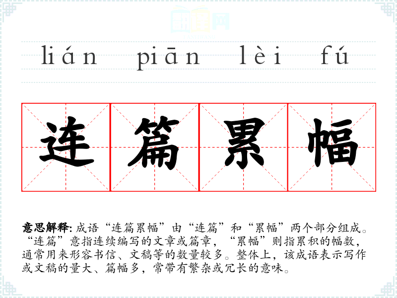成语“连篇累幅”由“连篇”和“累幅”两个部分组成。“连篇”意指连续编写的文章或篇章,“累幅”则指累积的幅数,通常用来形容书信、文稿等的数量较多。整体上,该成语表示写作或文稿的量大、篇幅多,常带有繁杂或冗长的意味。