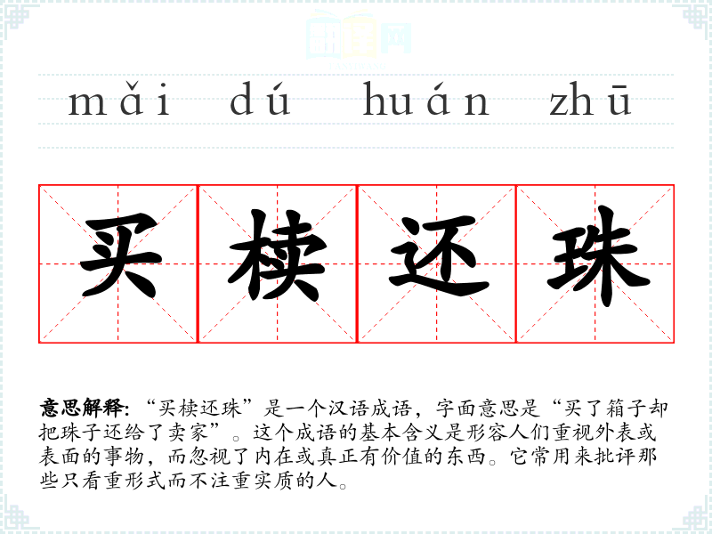 “买椟还珠”是一个汉语成语,字面意思是“买了箱子却把珠子还给了卖家”。这个成语的基本含义是形容人们重视外表或表面的事物,而忽视了内在或真正有价值的东西。它常用来批评那些只看重形式而不注重实质的人。