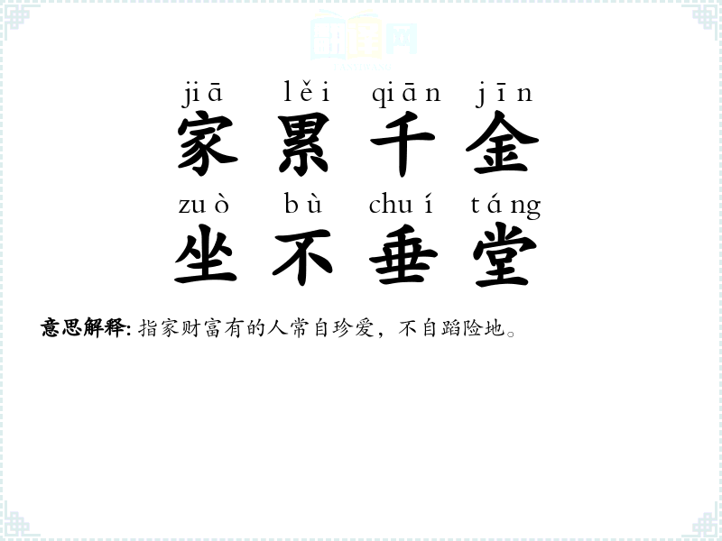 垂堂:靠近屋檐的地方。家有千金的人不在屋檐下停留。形容有钱人非常看中自己的身体。 |
