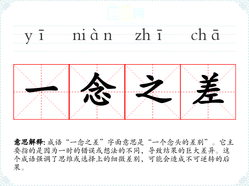 成语“一念之差”字面意思是“一个念头的差别”。它主要指的是因为一时的错误或想法的不同,导致结果的巨大差异。这个成语强调了思维或选择上的细微差别,可能会造成不可逆转的后果。