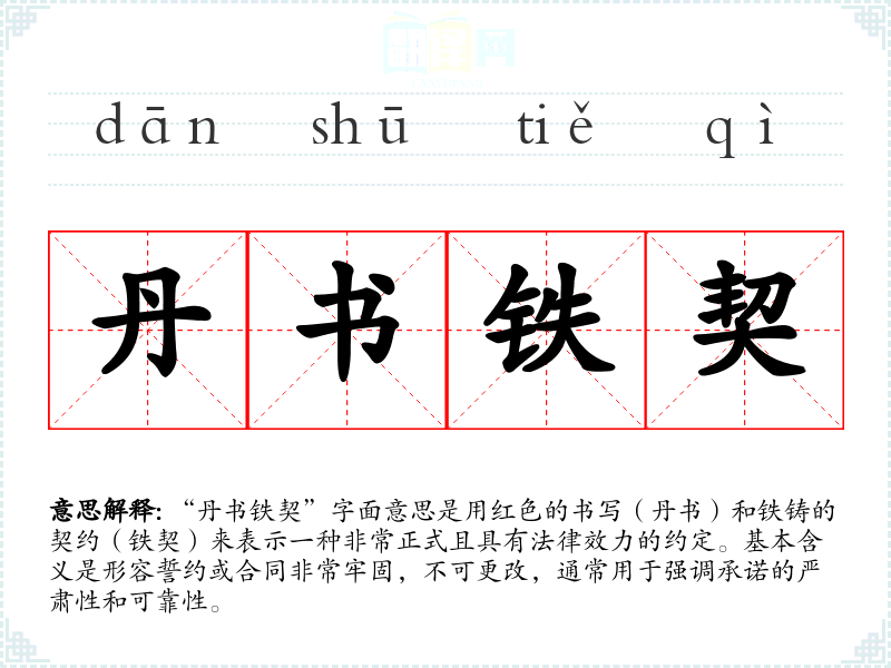 “丹书铁契”字面意思是用红色的书写(丹书)和铁铸的契约(铁契)来表示一种非常正式且具有法律效力的约定。基本含义是形容誓约或合同非常牢固,不可更改,通常用于强调承诺的严肃性和可靠性。