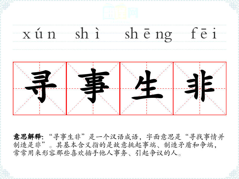 “寻事生非”是一个汉语成语,字面意思是“寻找事情并制造是非”。其基本含义指的是故意挑起事端、制造矛盾和争端,常常用来形容那些喜欢插手他人事务、引起争议的人。