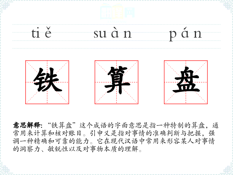 “铁算盘”这个成语的字面意思是指一种特制的算盘,通常用来计算和核对账目。引申义是指对事情的准确判断与把握,强调一种精确和可靠的能力。它在现代汉语中常用来形容某人对事情的洞察力、敏锐性以及对事物本质的理解。