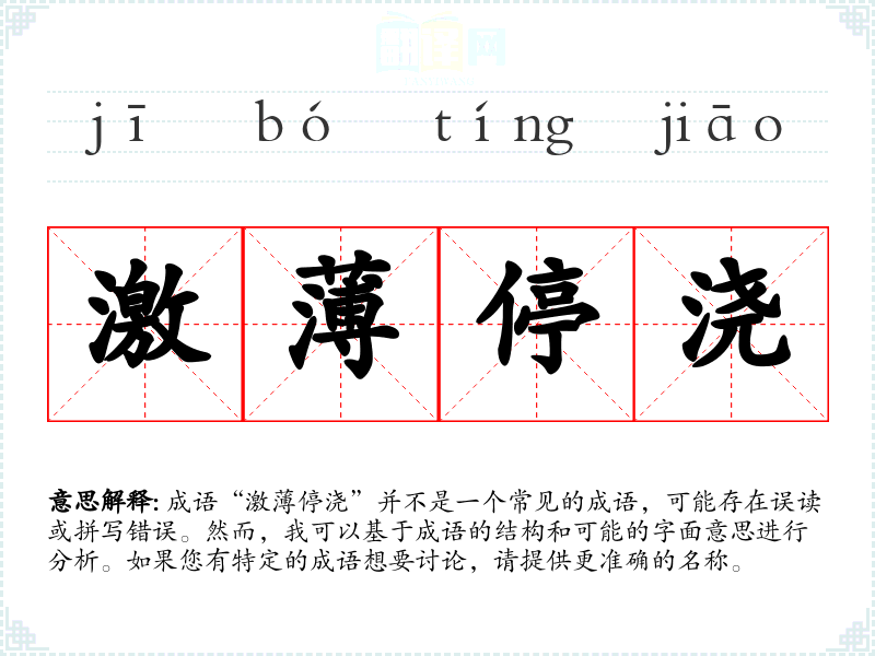 成语“激*停浇”并不是一个常见的成语,可能存在误读或拼写错误。然而,我可以基于成语的结构和可能的字面意思进行分析。如果您有特定的成语想要讨论,请提供更准确的名称。