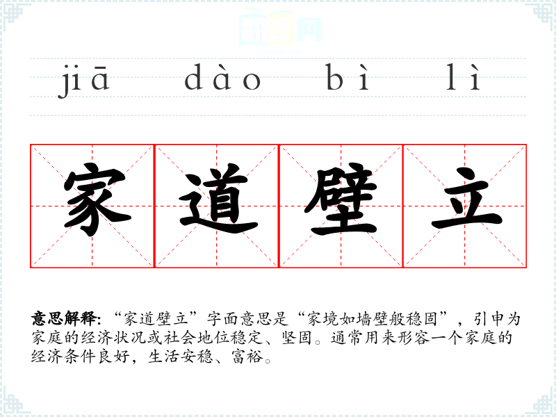 “家道壁立”字面意思是“家境如墙壁般稳固”,引申为家庭的经济状况或社会地位稳定、坚固。通常用来形容一个家庭的经济条件良好,生活安稳、富裕。