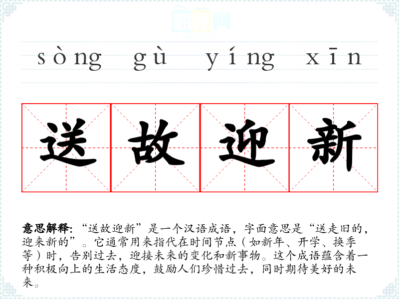 “送故迎新”是一个汉语成语,字面意思是“送走旧的,迎来新的”。它通常用来指代在时间节点(如新年、开学、换季等)时,告别过去,迎接未来的变化和新事物。这个成语蕴含着一种积极向上的生活态度,鼓励人们珍惜过去,同时期待美好的未来。