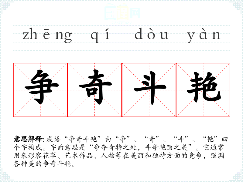 成语“争奇斗艳”由“争”、“奇”、“斗”、“艳”四个字构成。字面意思是“争夺奇特之处,斗争艳丽之美”。它通常用来形容花草、艺术作品、人物等在美丽和独特方面的竞争,强调各种美的争奇斗艳。