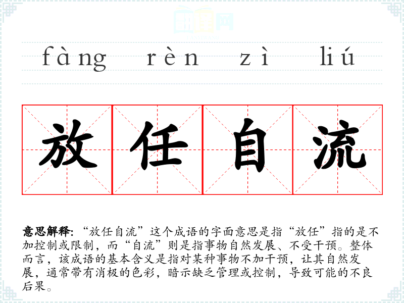 “放任自流”这个成语的字面意思是指“放任”指的是不加控制或限制,而“自流”则是指事物自然发展、不受干预。整体而言,该成语的基本含义是指对某种事物不加干预,让其自然发展,通常带有消极的色彩,暗示缺乏管理或控制,导致可能的不良后果。