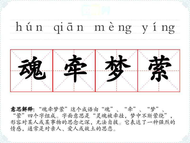 “魂牵梦萦”这个成语由“魂”、“牵”、“梦”、“萦”四个字组成。字面意思是“灵魂被牵挂,梦中不断萦绕”,形容对某人或某事物的思念之深,无法自拔。它表达了一种强烈的情感,通常是对亲人、爱人或故土的思恋。