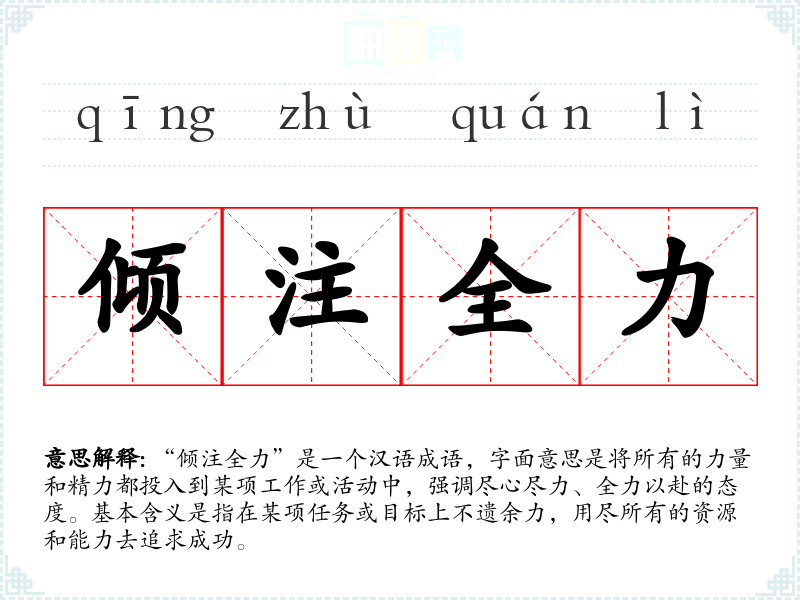 倾注全力 倾注:把精神或力量集中到一个目标。把所有力量集中在一个目标。