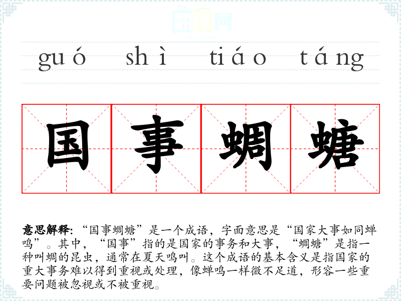 “国事蜩螗”是一个成语,字面意思是“国家大事如同蝉鸣”。其中,“国事”指的是国家的事务和大事,“蜩螗”是指一种叫蜩的昆虫,通常在夏天鸣叫。这个成语的基本含义是指国家的重大事务难以得到重视或处理,像蝉鸣一样微不足道,形容一些重要问题被忽视或不被重视。