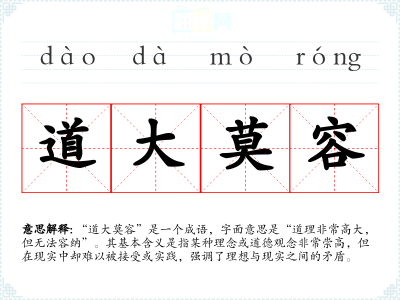 “道大莫容”是一个成语,字面意思是“道理非常高大,但无法容纳”。其基本含义是指某种理念或道德观念非常崇高,但在现实中却难以被接受或实践,强调了理想与现实之间的矛盾。
