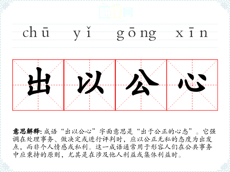 成语“出以公心”字面意思是“出于公正的心态”。它强调在处理事务、做决定或进行评判时,应以公正无私的态度为出发点,而非个人情感或私利。这一成语通常用于形容人们在公共事务中应秉持的原则,尤其是在涉及他人利益或集体利益时。