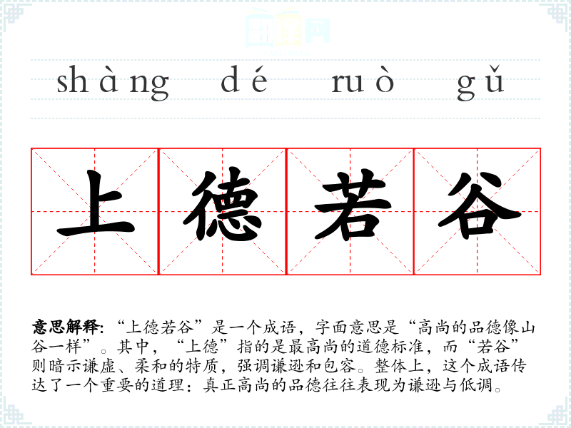 | 上德若谷 | 上德:最高的道德;谷:溪谷。形容具有崇高道德的人胸怀如同山谷一样深广,可以容纳一切。 |