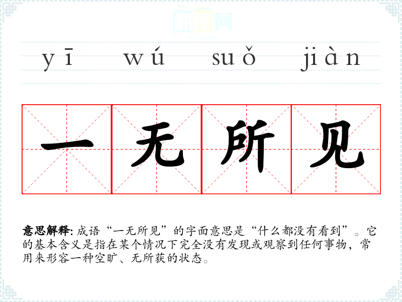 成语“一无所见”的字面意思是“什么都没有看到”。它的基本含义是指在某个情况下完全没有发现或观察到任何事物,常用来形容一种空旷、无所获的状态。