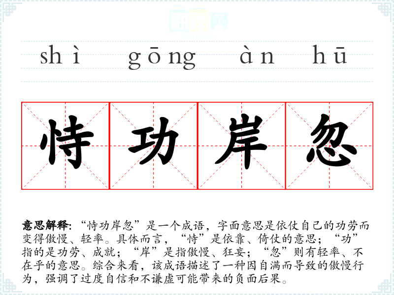 | 恃功岸忽 | 恃:倚仗;岸忽:怠慢。自恃有功,傲慢无理。 |