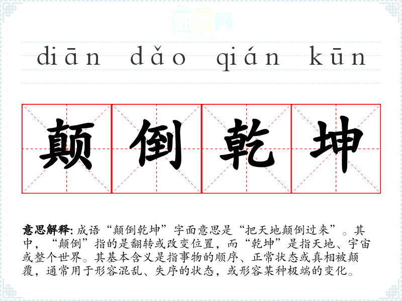 成语“颠倒乾坤”字面意思是“把天地颠倒过来”。其中,“颠倒”指的是翻转或改变位置,而“乾坤”是指天地、宇宙或整个世界。其基本含义是指事物的顺序、正常状态或真相被颠覆,通常用于形容混乱、失序的状态,或形容某种极端的变化。
