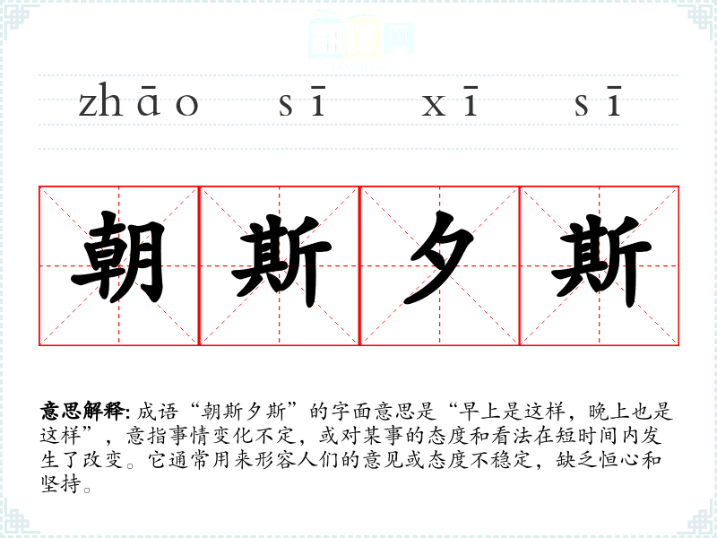 成语“朝斯夕斯”的字面意思是“早上是这样,晚上也是这样”,意指事情变化不定,或对某事的态度和看法在短时间内发生了改变。它通常用来形容人们的意见或态度不稳定,缺乏恒心和坚持。