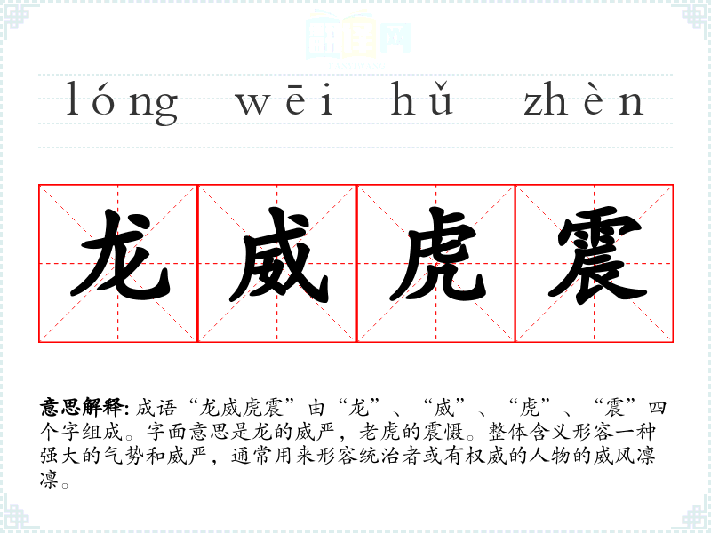 成语“龙威虎震”由“龙”、“威”、“虎”、“震”四个字组成。字面意思是龙的威严,**的震慑。整体含义形容一种强大的气势和威严,通常用来形容统治者或有权威的人物的威风凛凛。
