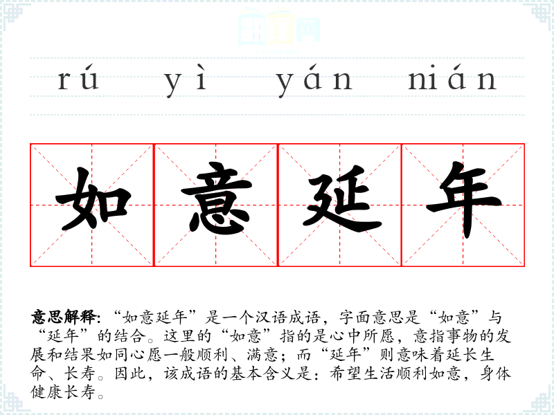 “如意延年”并没有明确的历史典故来源,但其构成的两个词“如意”和“延年”在古代文化中都有深厚的背景。“如意”在古代常用作吉祥物,象征着好运与心愿的实现;而“延年”则与长寿相关,常被用来祝愿他人身体健康、长命百岁。这个成语可以视为传统祝福语的一种延续,体现了人对美好生活的向往。