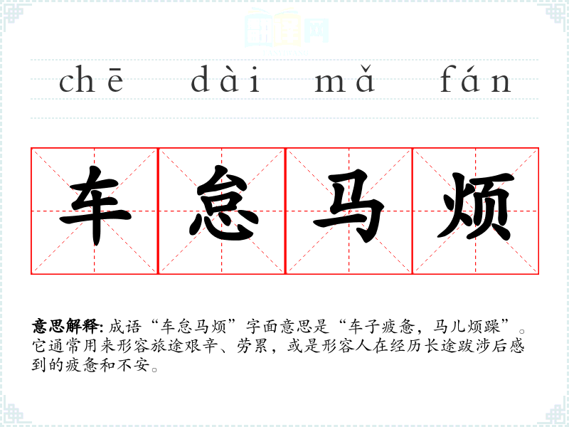 | 车殆马烦 | 殆:通“怠”,疲乏;烦:烦躁。形容旅途劳顿。 |