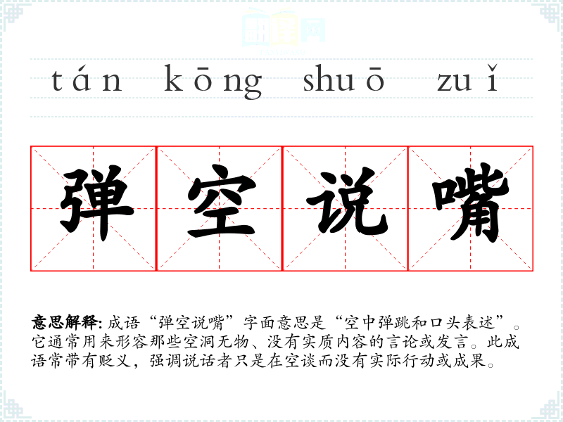成语“弹空说嘴”字面意思是“空中弹跳和口头表述”。它通常用来形容那些空洞无物、没有实质内容的言论或发言。此成语常带有贬义,强调说话者只是在空谈而没有实际行动或成果。