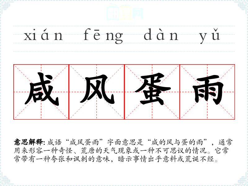成语“咸风蛋雨”字面意思是“咸的风与蛋的雨”,通常用来形容一种奇怪、荒唐的天气现象或一种不可思议的情况。它常常带有一种夸张和讽刺的意味,暗示事情出乎意料或荒诞不经。