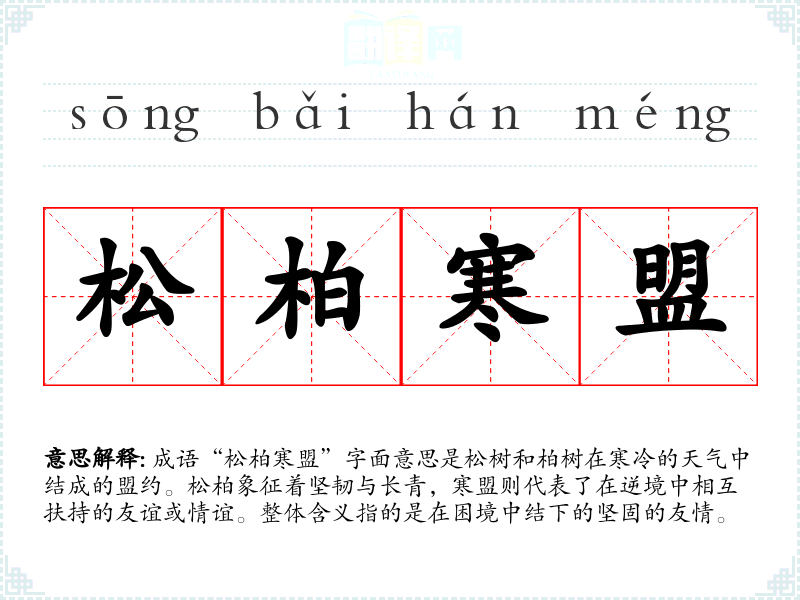 成语“松柏寒盟”字面意思是松树和柏树在寒冷的天气中结成的盟约。松柏象征着坚韧与长青,寒盟则代表了在逆境中相互扶持的友谊或情谊。整体含义指的是在困境中结下的坚固的友情。