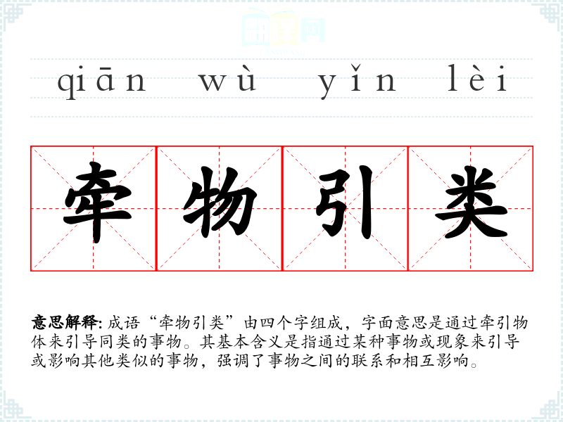 成语“牵物引类”由四个字组成,字面意思是通过牵引物体来引导同类的事物。其基本含义是指通过某种事物或现象来引导或影响其他类似的事物,强调了事物之间的联系和相互影响。