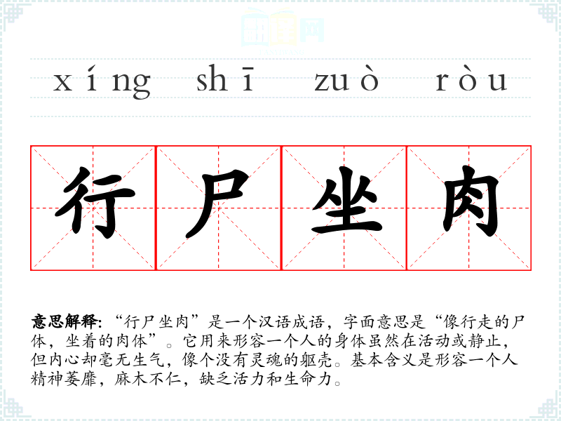 “行尸坐肉”是一个汉语成语,字面意思是“像行走的尸体,坐着的肉体”。它用来形容一个人的身体虽然在活动或静止,但内心却毫无生气,像个没有灵魂的躯壳。基本含义是形容一个人精神萎靡,麻木不仁,缺乏活力和生命力。