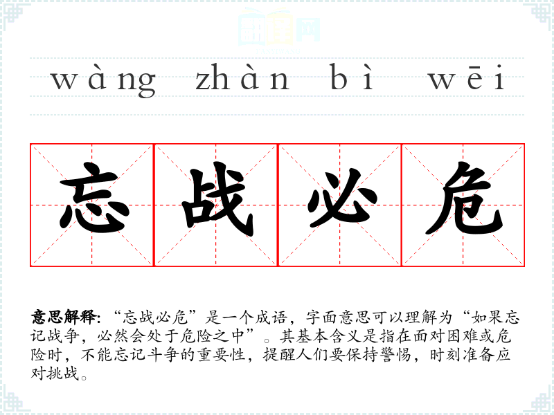 - 领导在会议上警告大家:“忘战必危”,我们必须保持高昂斗志,迎接新的挑战。